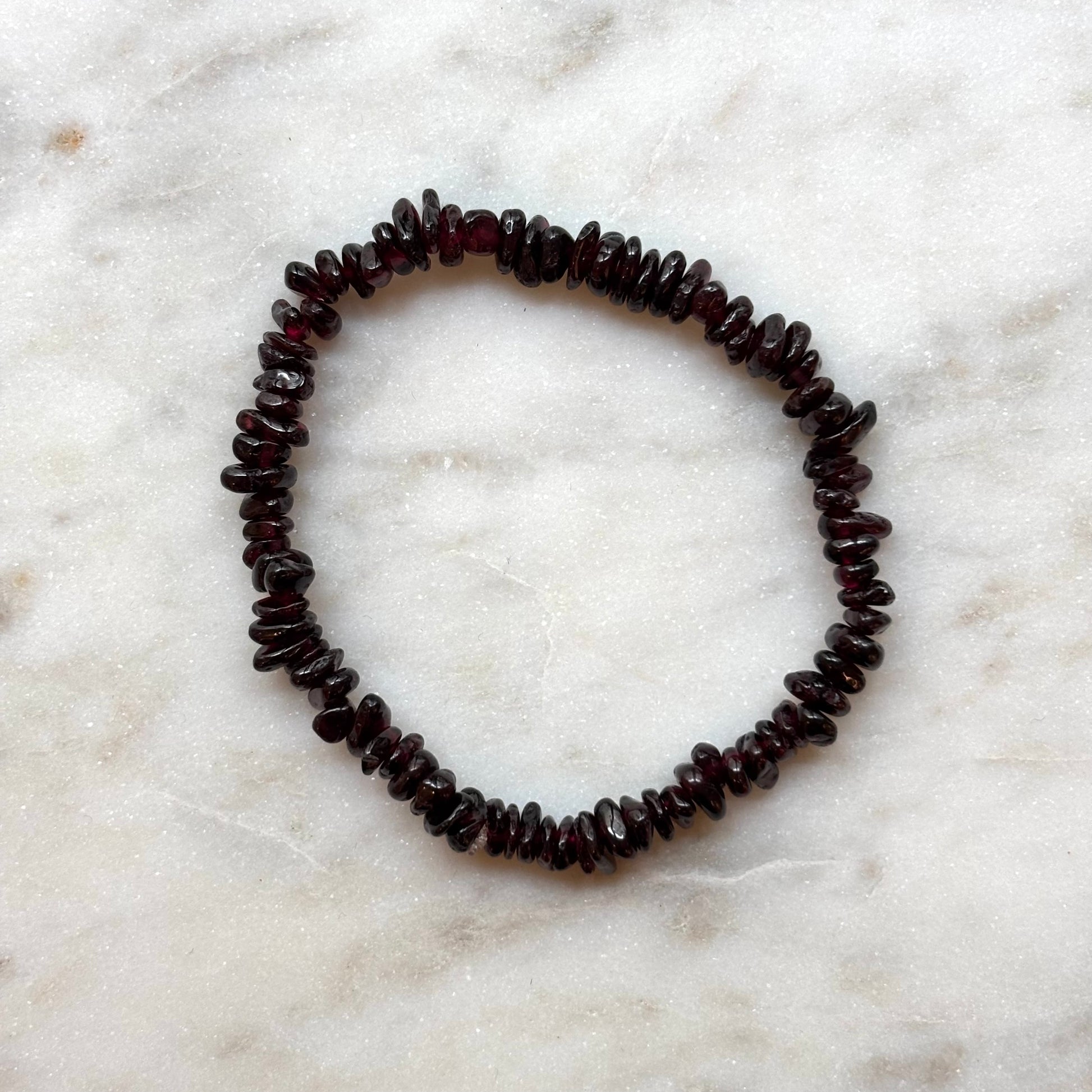 Das Armband besteht aus dunkelrotem Granat. Aufgefädelt wurden die Perlen auf einem Gummi