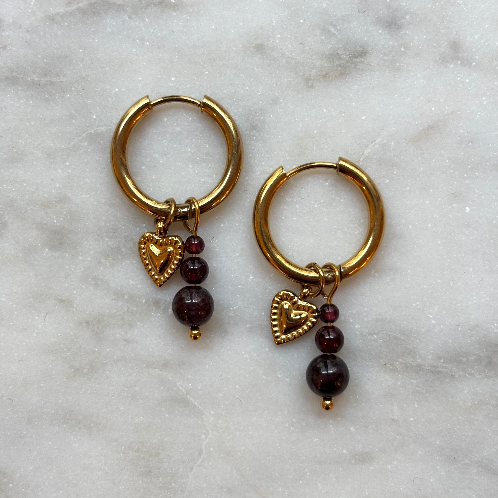 Entdecke unsere wasserfesten Edelstahlohrringe in strahlendem Gold, die mit einem zauberhaften Anhänger in Form eines Herzens und dunkelroten Granaten versehen sind. Diese einzigartigen Ohrringe vereinen Eleganz und Funktionalität, perfekt für jeden Anlass.