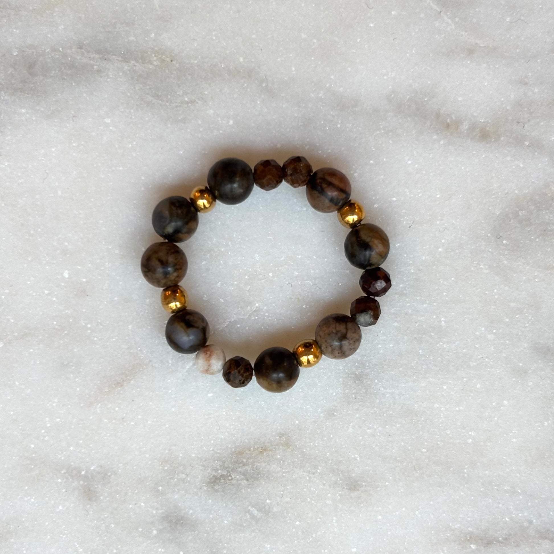 Die Ringe bestehen aus vorwiegend braunen Halbedelsteinen und werden auf Bestellung hergestellt.