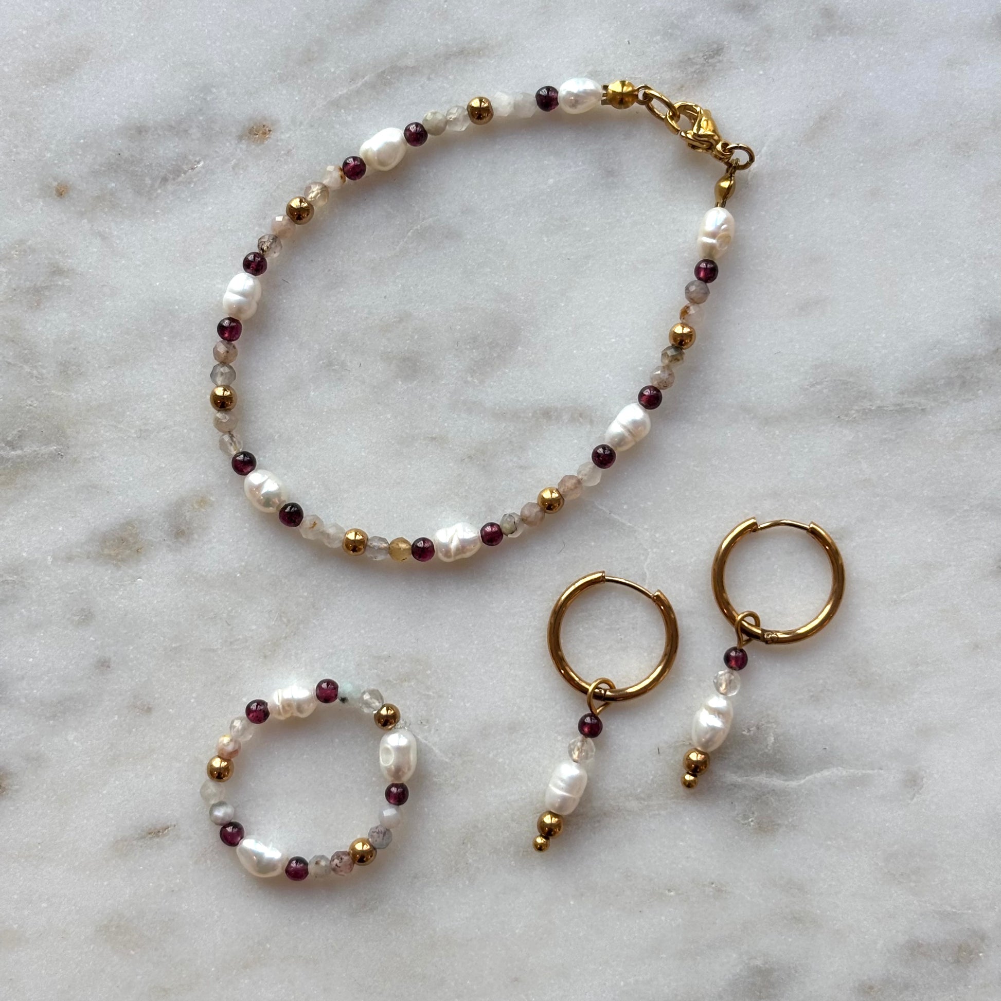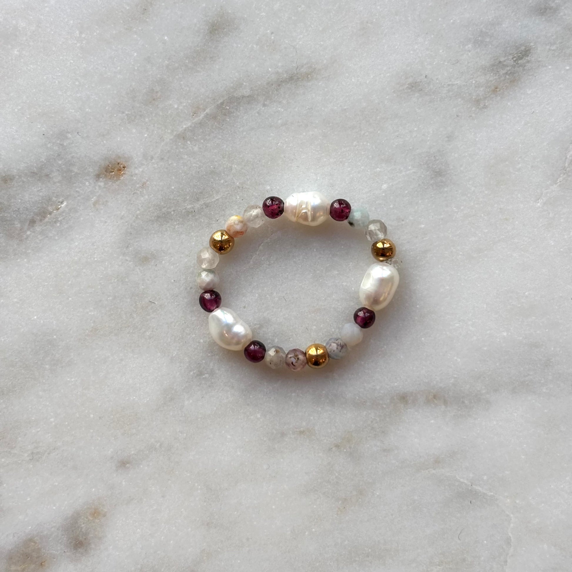 Die Ringe bestehen aus Süßwasserperlen und Halbedelsteinen und werden auf Bestellung hergestellt.