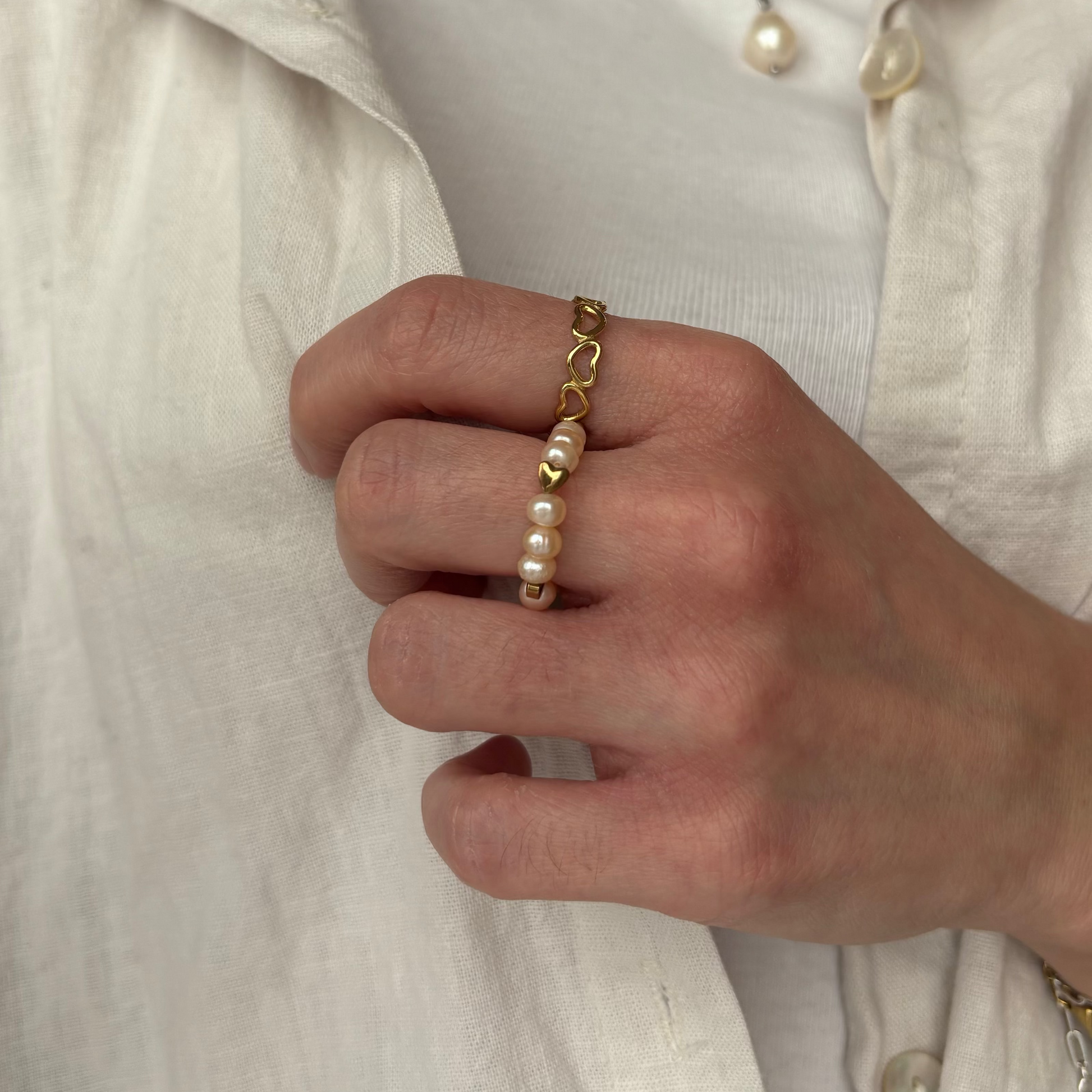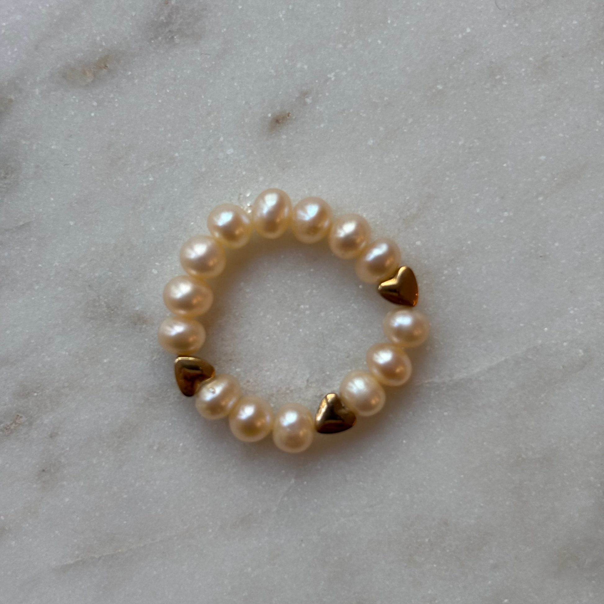 Die Ringe bestehen aus kleinen runden Süßwasserperlen und goldenen Herzchen und werden auf Bestellung hergestellt.